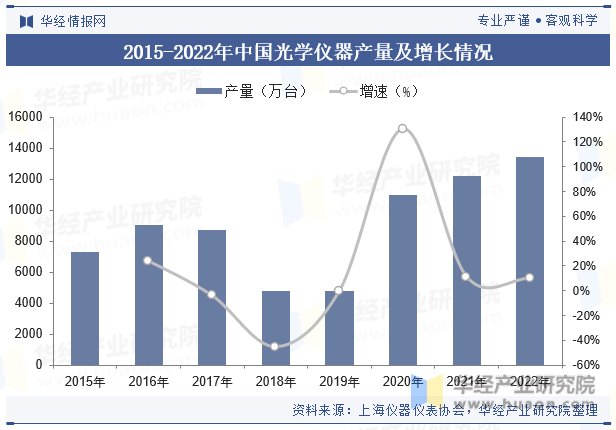 光學儀器是儀器儀表行業中非常重要的組成類別,從產量來看,近幾年國內光學儀器產量大幅增長,2020年中國光學儀器產量突破1億臺,同比增速達130.35%2022年產量增長至1.35億臺,同比上漲10.05%