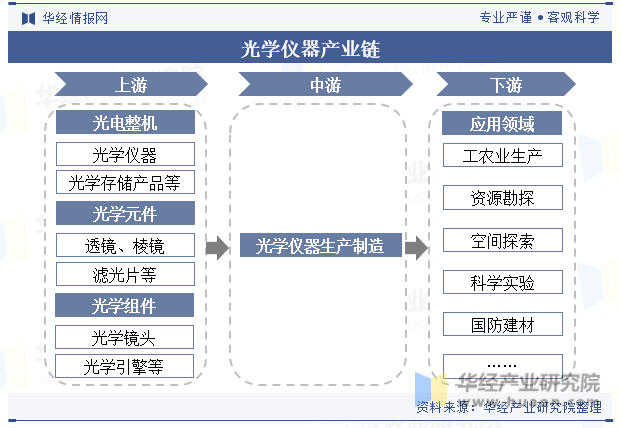 我國光學儀器行業產業鏈上游主要包括光電整機、光學元件以及光學組件供應商;中游為光學儀器生產制造環節,下游應用領域廣泛,是工農業生產、資源勘探空間探索、科學實驗、國防建設以及社會生活各個領域不可缺少的觀察、測試分析、控制、記錄和傳遞的工具。