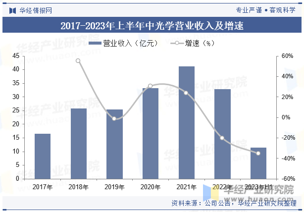 中光學集團成立于1991年,是中國光學儀器行業的領先企業之一。公司總部位于北京,擁有多個制造基地和研發中心,先后榮獲多項級獎項,是中國光學儀器行業的標志性企業。2022年受疫情反復、芯片短缺等綜合因素影響,營業收入下降至32.85億元,同比縮減20.44%2023年上半年實現營收11.5億元,較2022年同比減少35.54%