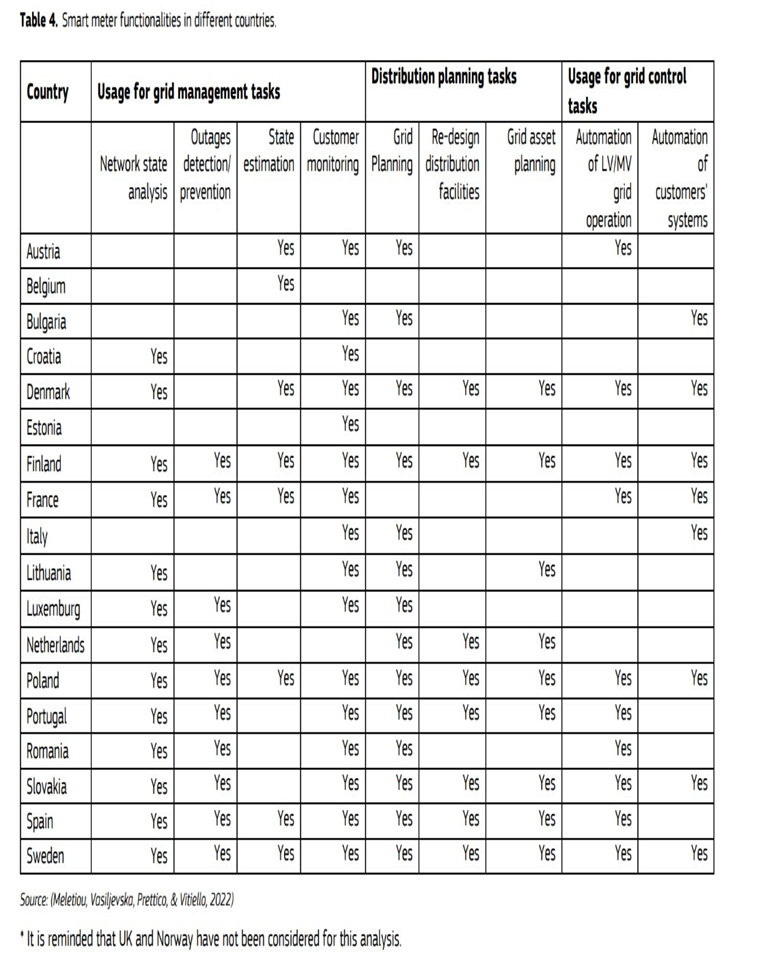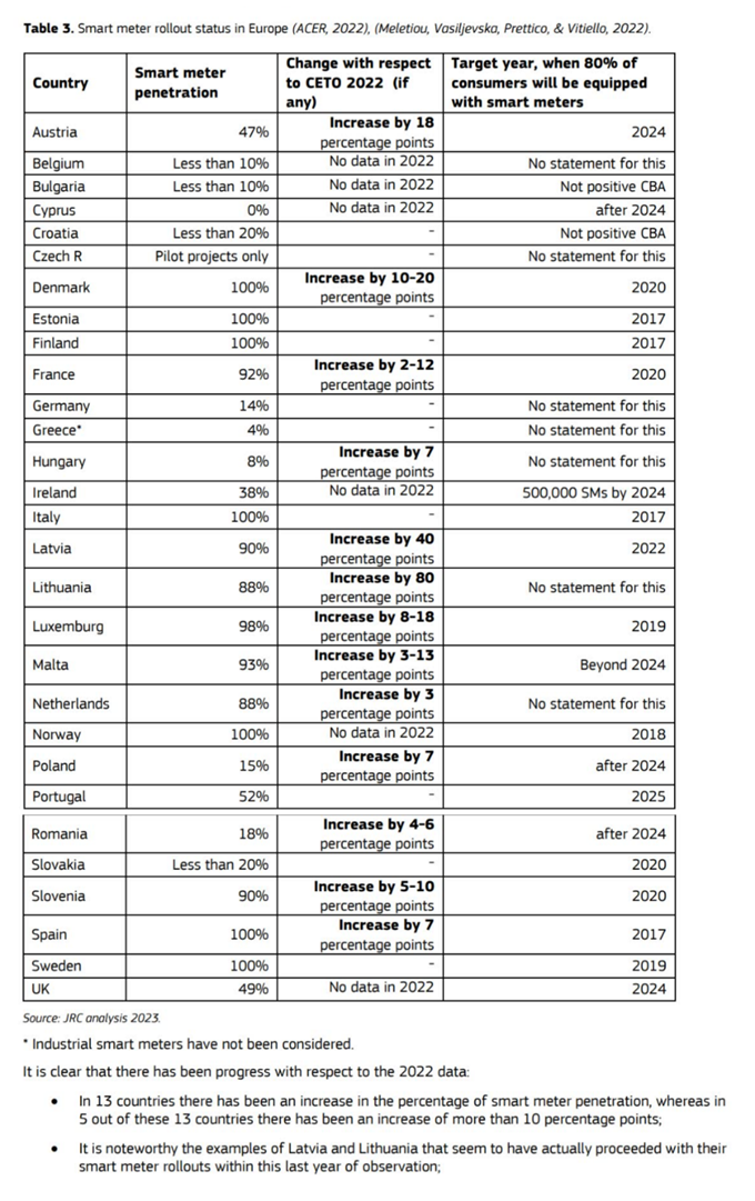參與 JRC 調查的四分之三的 DSO 回答說,他們的智能電表覆蓋率低于 10%。另一方面,一個DSO報告的覆蓋率為40%。有關比利時的數據表明,一個DSO的智能電表覆蓋率不到5%。下表顯示了不同國家/地區2022年的智能電表部署狀態,包括挪威和英國的信息。