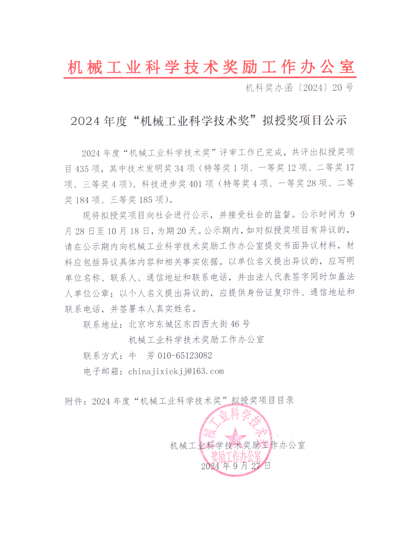 中國機械工業(yè)聯(lián)合會已將擬授獎項目向社會進行公示,并接受社會的監(jiān)督。公示時間為9月28日至10月18日,為期20天。公示期內(nèi),如對擬授獎項目有異議的,請在公示期內(nèi)向機械工業(yè)科學(xué)技術(shù)獎勵工作辦公室提交書面異議材料,材料應(yīng)包括異議具體內(nèi)容和相關(guān)事實依據(jù)。以單位名義提出異議的,應(yīng)寫明單位名稱、聯(lián)系人、通信地址和聯(lián)系電話,并由法人代表簽字同時加蓋法人單位公章;以個人名義提出異議的,應(yīng)提供身份證復(fù)印件、通信地址和聯(lián)系電話,并簽署本人真實姓名。