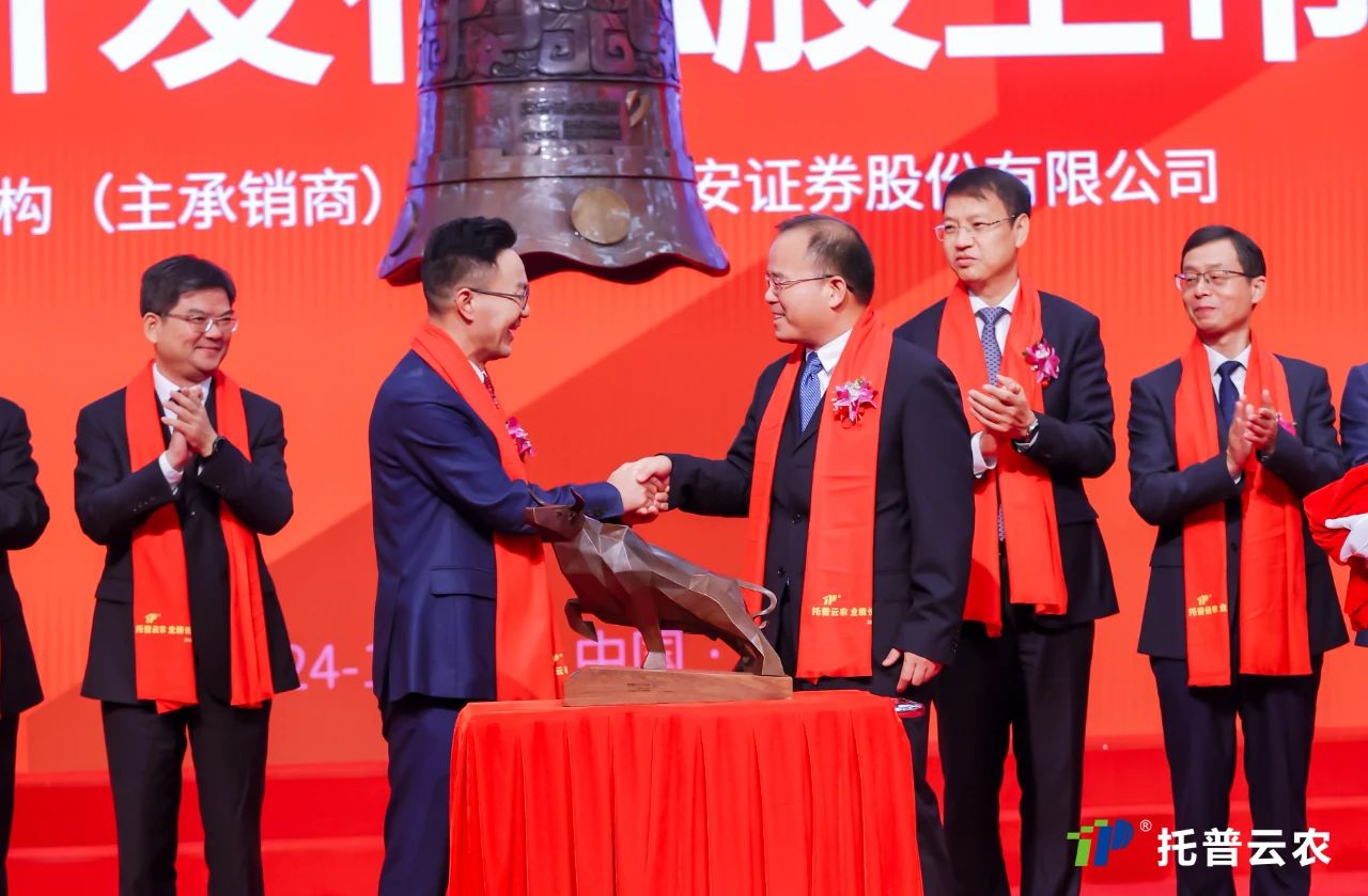 儀式現場,中國證監會上市公司監管部二級巡視員、深圳證券交易所第一屆并購重組審核委員會委員郭軍旺與托普云農董事長陳渝陽共同簽署《證券上市協議》,并向托普云農贈送創業銅牛作為上市紀念,祝愿公司開拓創新、行穩致遠,繼續為客戶、合作伙伴和廣大投資者創造價值。悠揚洪亮的鐘聲響起,標志著托普云農正式邁入資本市場,成為創業板一顆冉冉升起的新星。