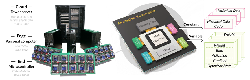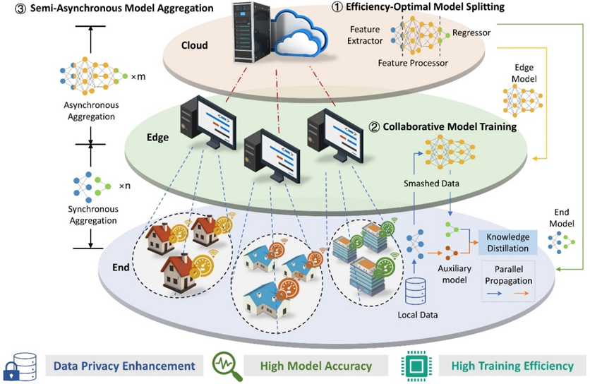 目前市場化的智能電表產(chǎn)品僅具備電能計量和雙向通訊的功能。如果智能電表能夠在本地對收集的海量數(shù)據(jù)進行智能分析處理,電力系統(tǒng)可以在無需額外投資的情況下提高能源管理效率、降低用戶電力消費、以及緩解云平臺計算壓力。然而,智能電表的內(nèi)存、計算和通信硬件資源和數(shù)據(jù)資源有限,難以支撐復(fù)雜的神經(jīng)網(wǎng)絡(luò)訓(xùn)練任務(wù)。為此,該論文通過結(jié)合聯(lián)邦學(xué)習(xí)和分割學(xué)習(xí),提出了一種創(chuàng)新的云-邊-端架構(gòu),有效解決了智能電表在硬件資源和數(shù)據(jù)資源方面的雙重限制的問題。