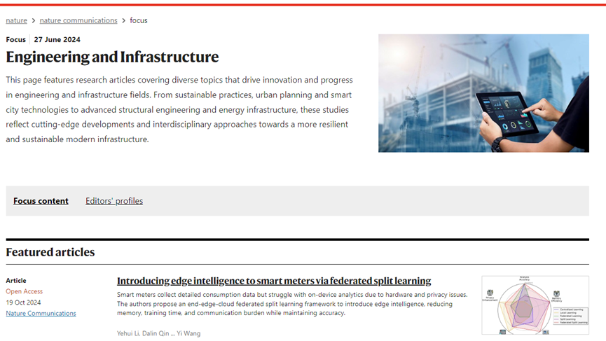 近日,國際知名學(xué)術(shù)期刊《Nature Communications》(圖1)在線刊登了香港大學(xué)王毅教授團隊與普林斯頓大學(xué)研究團隊的最新成果——通過聯(lián)邦分割學(xué)習(xí)為智能電表引入邊緣智能(Introducing Edge Intelligence to Smart Meters via Federated Split Learning)。該論文同時被編輯推薦為工程與基礎(chǔ)設(shè)施領(lǐng)域前50篇最具亮點的精選論文(Editors’ Highlights pages aim to showcase the 50 best papers recently published in an area)(圖2)。