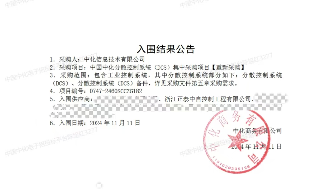 正泰中自成功入圍中國中化分散控制系統(DCS)集中