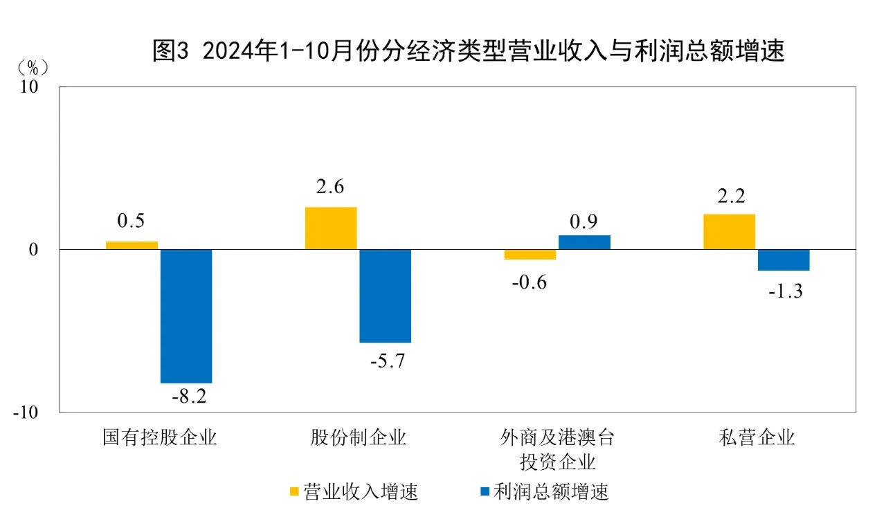 1—10月份,規(guī)模以上工業(yè)企業(yè)中,國(guó)有控股企業(yè)實(shí)現(xiàn)利潤(rùn)總額18530.9億元,同比下降8.2%;股份制企業(yè)實(shí)現(xiàn)利潤(rùn)總額43718.5億元,下降5.7%;外商及港澳臺(tái)投資企業(yè)實(shí)現(xiàn)利潤(rùn)總額14559.0億元,增長(zhǎng)0.9%;私營(yíng)企業(yè)實(shí)現(xiàn)利潤(rùn)總額16501.7億元,下降1.3%