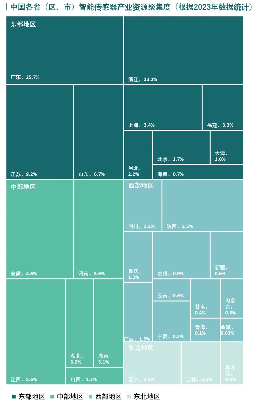中國智能傳感器區(qū)域發(fā)展整體呈現(xiàn)東部持續(xù)領(lǐng)先、中西部崛起有望的態(tài)勢。目前,東部地區(qū)聚集了全國67.1%的產(chǎn)業(yè)資源,廣東、浙江、江蘇、山東、上海等省(市)的企業(yè)資源領(lǐng)跑全國。近年來,中部的安徽、河南、湖北等地以及西部的四川、陜西、重慶等地,也在持續(xù)加大對(duì)智能傳感器產(chǎn)業(yè)的支持力度。十五五時(shí)期,中國的智能傳感器產(chǎn)業(yè)資源將仍以東部為引領(lǐng),但中西部的部分省份也將逐步崛起,實(shí)現(xiàn)區(qū)域多點(diǎn)開花的發(fā)展格局。