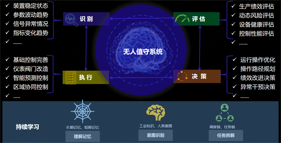 “無人”值守能夠?qū)⑵髽I(yè)較為稀缺的人力資源從復(fù)雜、繁瑣、重復(fù)的操作活動中解放出來,提升裝置運(yùn)行水平、安全水平和效益,減少非計劃停工,對裝置的長周期、高效自主運(yùn)行具有深遠(yuǎn)意義,是化工裝置“安、穩(wěn)、長、滿、優(yōu)”高度自主運(yùn)行的集中體現(xiàn)。區(qū)別于傳統(tǒng)的“黑屏操作”,“無人”值守的關(guān)鍵在于裝置系統(tǒng)能夠具備“識別-評估-決策-執(zhí)行”的自主能力,實現(xiàn)對外部的需求或干擾進(jìn)行自主響應(yīng),同時又可對系統(tǒng)內(nèi)部要素的完整性、健康性、穩(wěn)定性進(jìn)行自我管理,最終達(dá)到無需人工干預(yù)、實現(xiàn)無人值守的目標(biāo)。