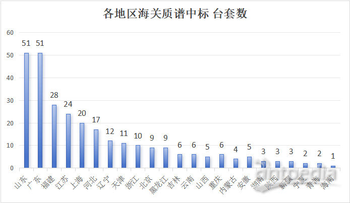 在地區分布上,山東和廣東以51臺套的采購量并列第一,福建以28臺套緊隨其后,江蘇采購24臺套,上海采購20臺套。這五個地區共采購了174臺套,成為采購的主力軍。