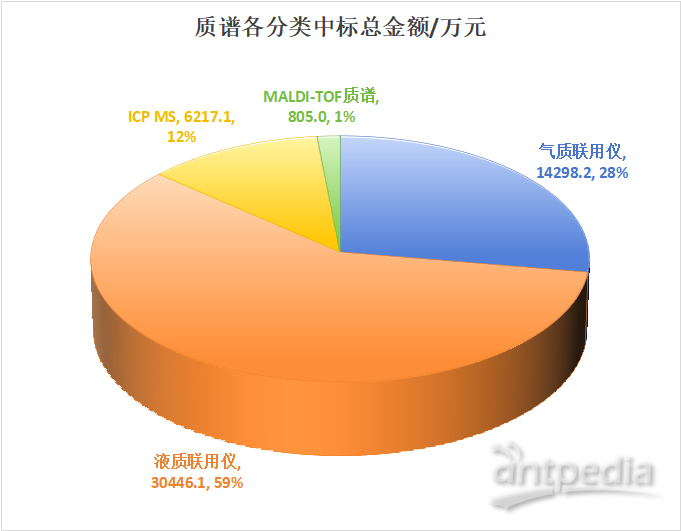 盡管氣質聯用儀在中標數量上略勝一籌,但從中標總金額來看,液質聯用儀以超過3億元的中標金額占據了質譜總中標金額的59%,顯示出其在高端市場的強大競爭力。氣質聯用儀的中標金額為1.4億元,占總金額的28%ICP MS的中標金額為6217.1萬元,MALDI-TOF質譜的中標金額為805.0萬元。