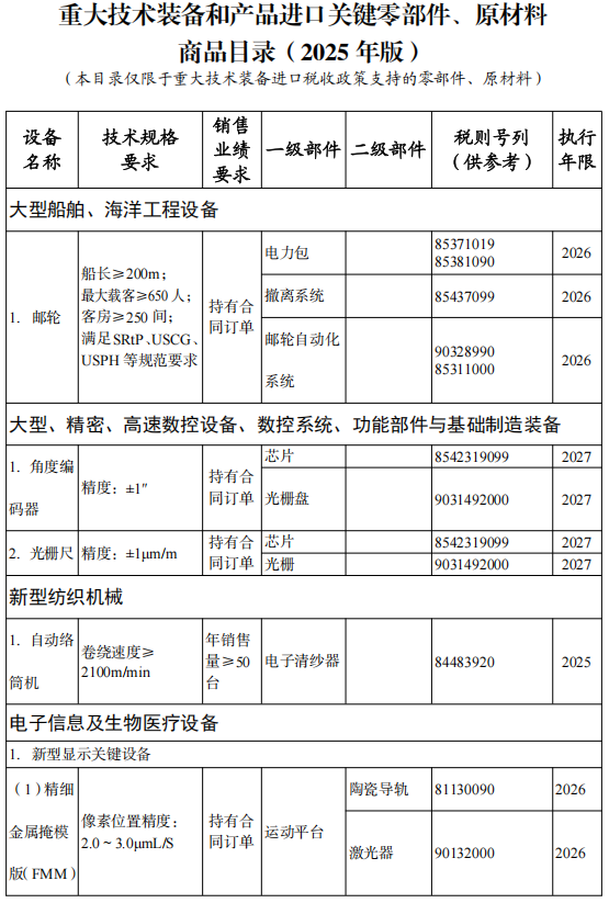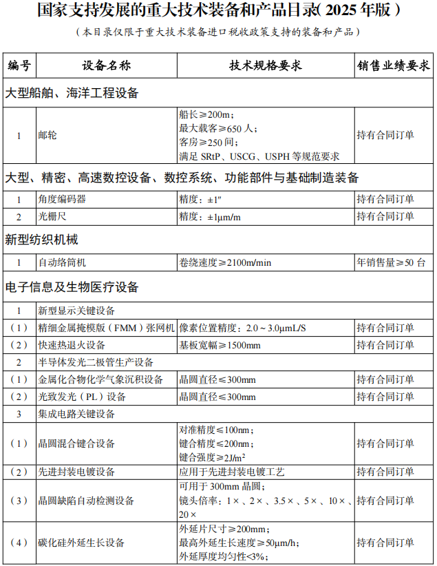 同步發布《國家支持發展的重大技術裝備和產品目錄(2025年版)》、《重大技術裝備和產品進口關鍵零部件、原材料商品目錄(2025年版)》和《進口不予免稅的重大技術裝備和產品目錄(2025年版)》,自202531日起執行。