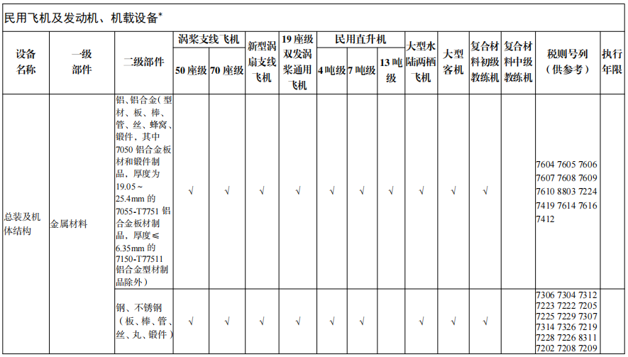 1)鋁、鋁合金(型材、板、棒、管、絲、蜂窩、鍛件,其中7050 鋁合金板材和鍛件制品,厚度為19.0525.4mm 7055-T7751 鋁合金板材制品,厚度≤6.35mm 7150-T77511鋁合金型材制品除外)
