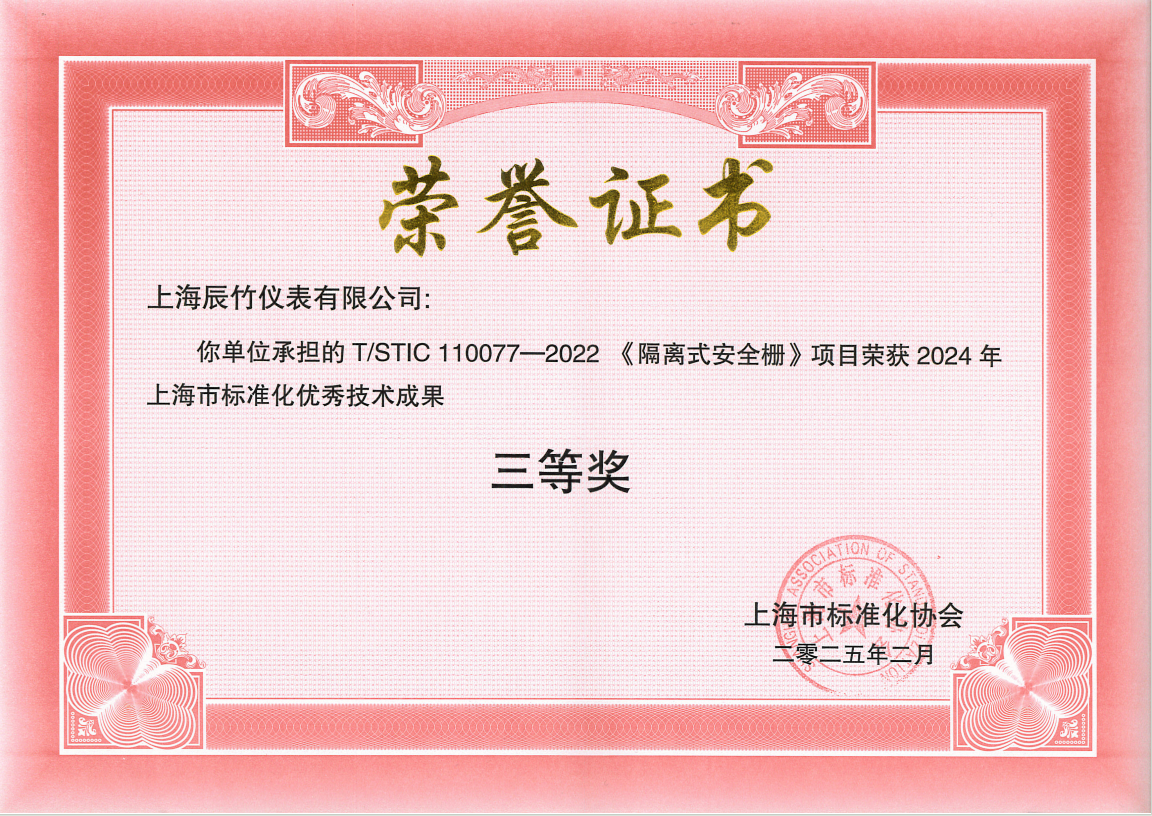 辰竹主導(dǎo)制定的 T/STIC 110077—2022《隔離式安全柵》團體標準榮獲2024年上海市標準化優(yōu)秀技術(shù)成果三等獎。2025年2月26日,以“標準引領(lǐng)未來,協(xié)作共促發(fā)展,不斷開創(chuàng)上海市標準化建設(shè)新局面”為主題的上海市標準化協(xié)會十屆三次會員代表大會召開,并對2024年上海市標準化優(yōu)秀成果進行表彰。