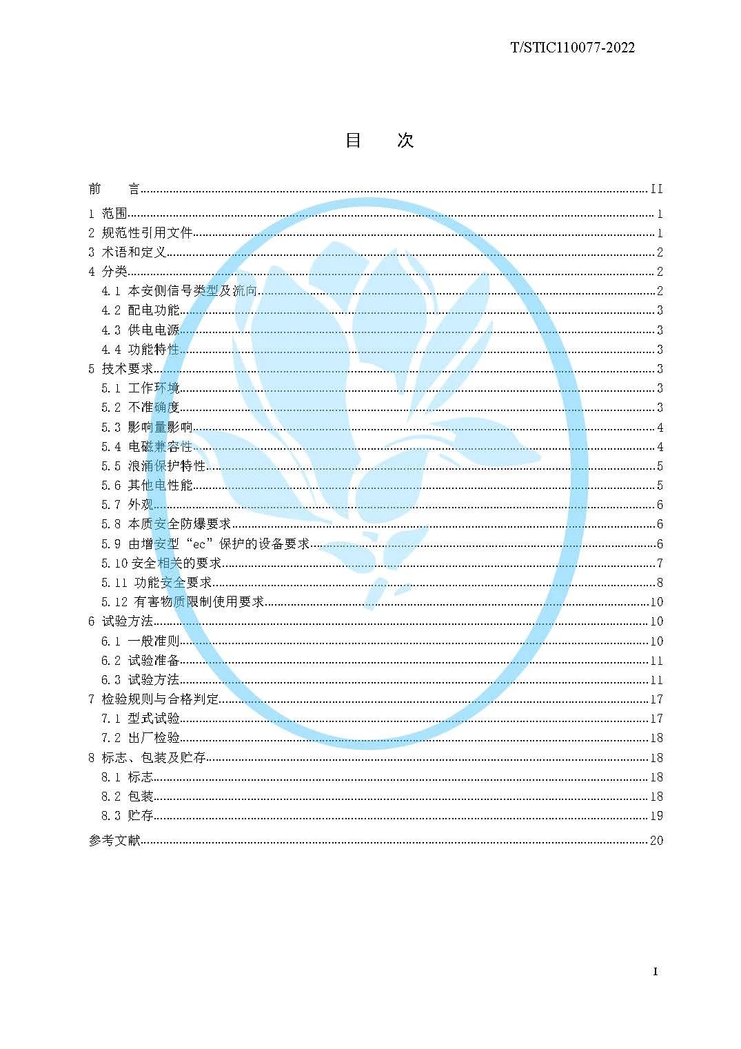 T/STIC 110077—2022《隔離式安全柵》標準規(guī)定了隔離式安全柵的分類、技術(shù)要求、試驗方法、 檢驗規(guī)則與合格判定,以及標志、包裝及貯存,適用于包括模擬信號、溫度信號和數(shù)字信號任何具有特定的輸入、輸出變量,且輸入輸出變量之間具有特定關(guān)系(傳遞函數(shù))的信號隔離和限能功能的隔離式安全柵。