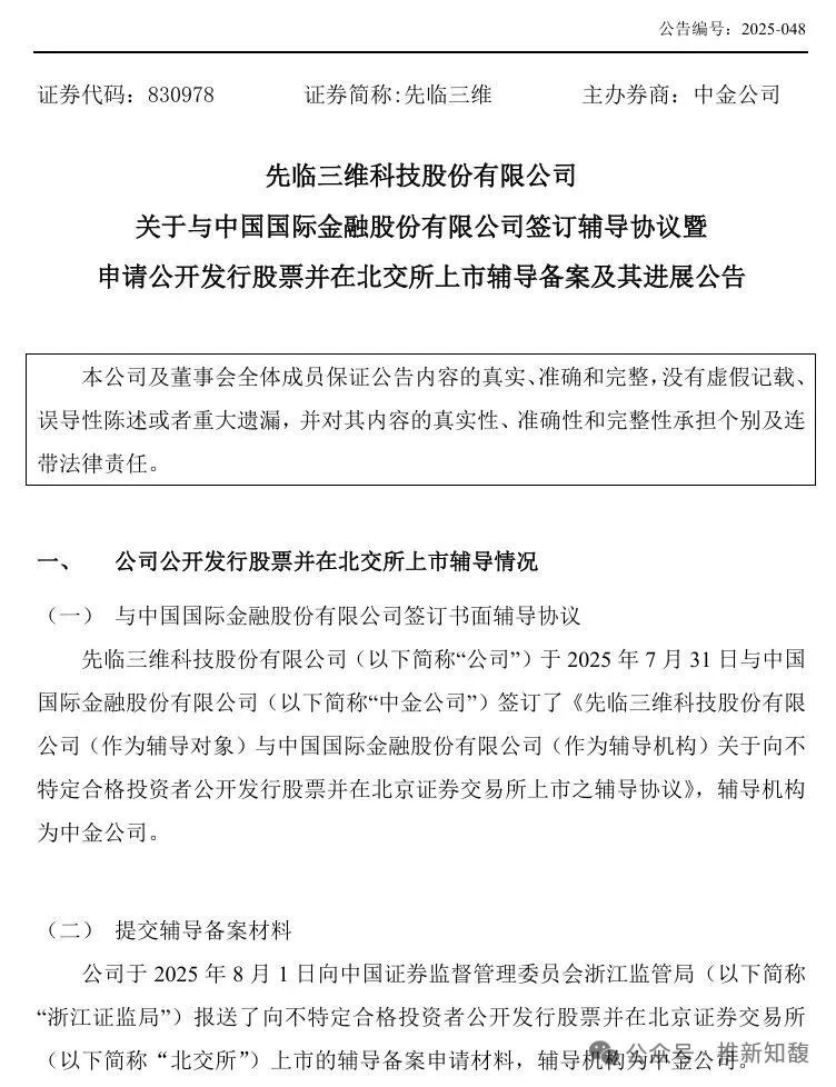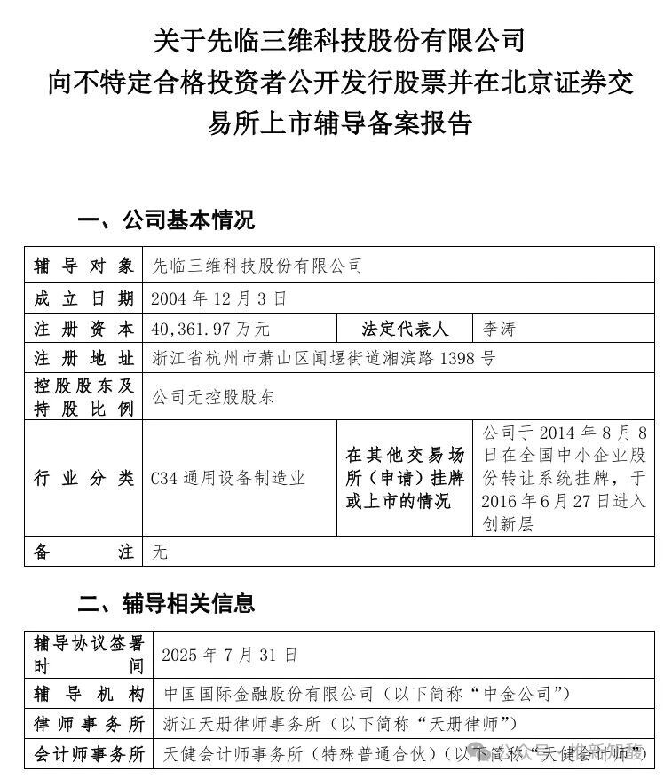 2025731日,先臨三維與中國國際金融股份有限公司(“中金公司”)簽訂輔導協議,正式啟動IPO進程。
