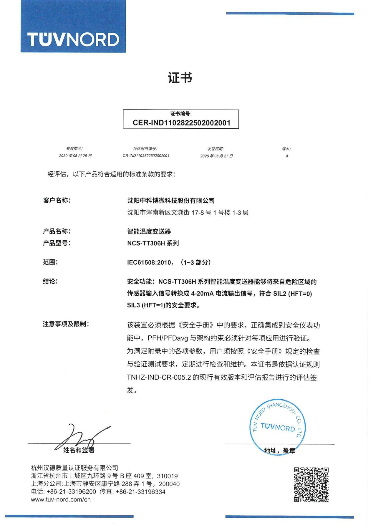 2025827日,沈陽中科博微科技股份有限公司自主研發的NCS-TT306H智能溫度變送器通過TÜV測試,喜獲功能安全SIL認證權威證書。這標志著中科博微的科技創新能力及產品成果已達到國際先進、國內領先水平,為更好開拓市場奠定了堅實的基礎。
