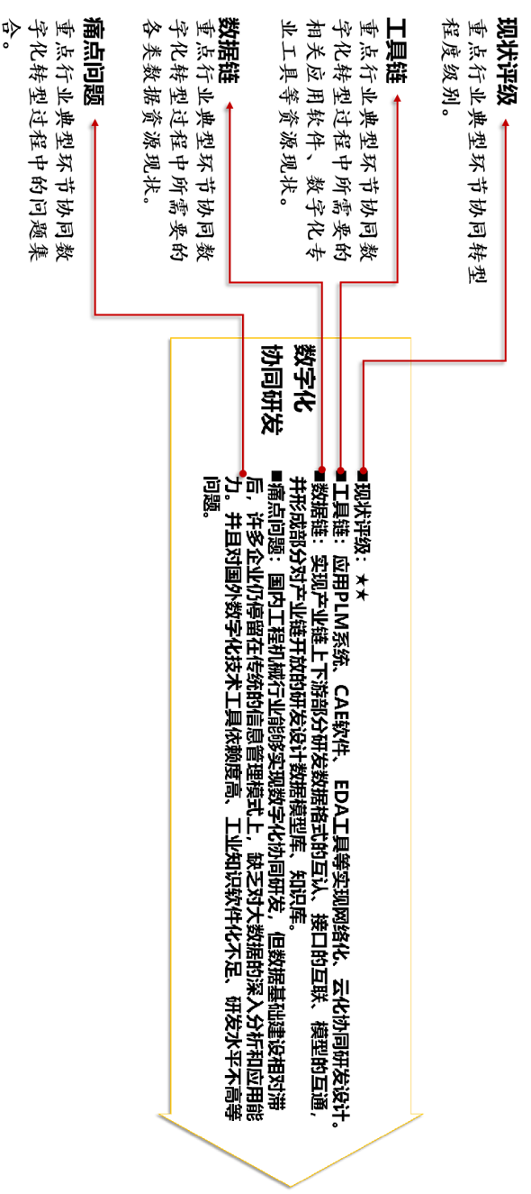 在行業(yè)場景圖譜中,每個場景由場景編號、場景名稱、場景現(xiàn)狀評級、場景轉(zhuǎn)型價值標(biāo)簽、各類數(shù)字化要素及場景痛點等內(nèi)容組成,以標(biāo)準(zhǔn)化的方式對所有場景進行描述和表達。單一場景以工程機械行業(yè)“產(chǎn)品整體研發(fā)設(shè)計和仿真測試”場景為例(如圖2所示),跨業(yè)務(wù)協(xié)同場景以鋼鐵行業(yè)“數(shù)字化協(xié)同管理”場景為例(如圖3所示)。