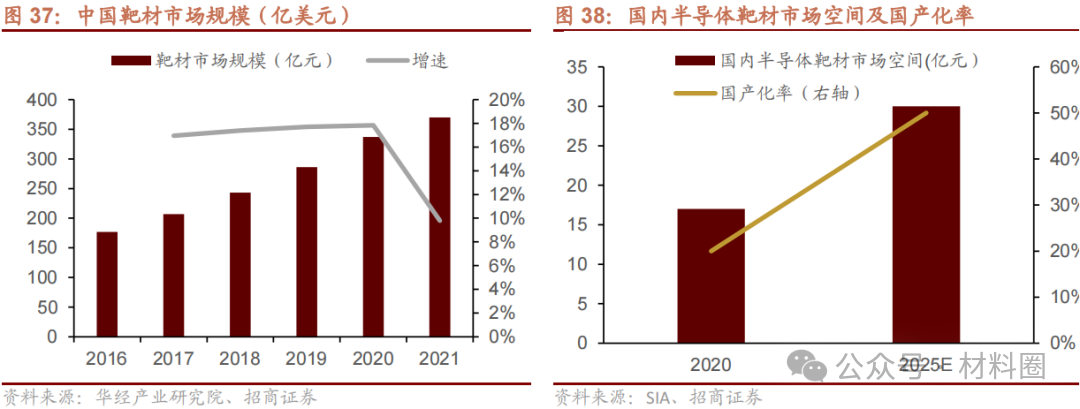 我國高端靶材主要從美日韓進口,半導體靶材國產化率僅20%。我國靶材市場規模約為370億元,與國際知名企業生產的濺射靶材相比,我國濺射靶材的生產水平還存在相當大的差距,高端靶材主要從美日韓進口。就半導體靶材而言,據SIA估計,2020年國內半導體領域用濺射靶材市場規模17億元人民幣,預計到2025年將增長至30億元人民幣。2020年國產化率僅20%,仍有巨大提升空間。
