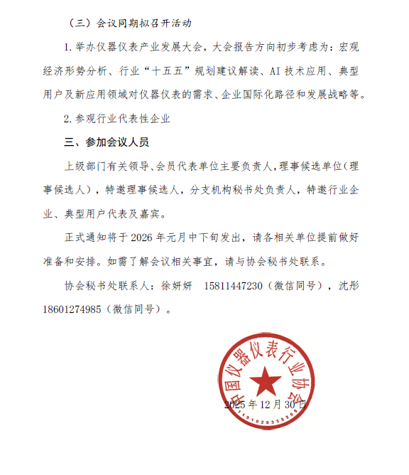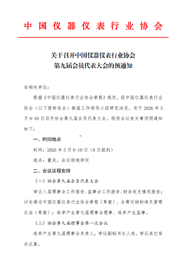 根據(jù)《中國(guó)儀器儀表行業(yè)協(xié)會(huì)章程》規(guī)定,經(jīng)中國(guó)儀器儀表行業(yè)協(xié)會(huì)(以下簡(jiǎn)稱協(xié)會(huì))換屆工作領(lǐng)導(dǎo)小組研究決定,定于2026 年3月8-10 日召開協(xié)會(huì)第九屆會(huì)員代表大會(huì)。現(xiàn)將會(huì)議有關(guān)事項(xiàng)預(yù)通知如下: