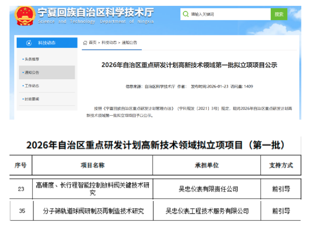 2026年1月23日,寧夏回族自治區(qū)科學(xué)技術(shù)廳發(fā)布2026年自治區(qū)重點(diǎn)研發(fā)計(jì)劃高新技術(shù)領(lǐng)域第一批擬立項(xiàng)項(xiàng)目名單,吳忠儀表有限責(zé)任公司申報(bào)的“高精度、長行程智能控制放料閥關(guān)鍵技術(shù)研究”、吳忠儀表工程技術(shù)服務(wù)有限公司申報(bào)的“分子篩軌道球閥研制及再制造技術(shù)研究”兩個(gè)項(xiàng)目成功入選。