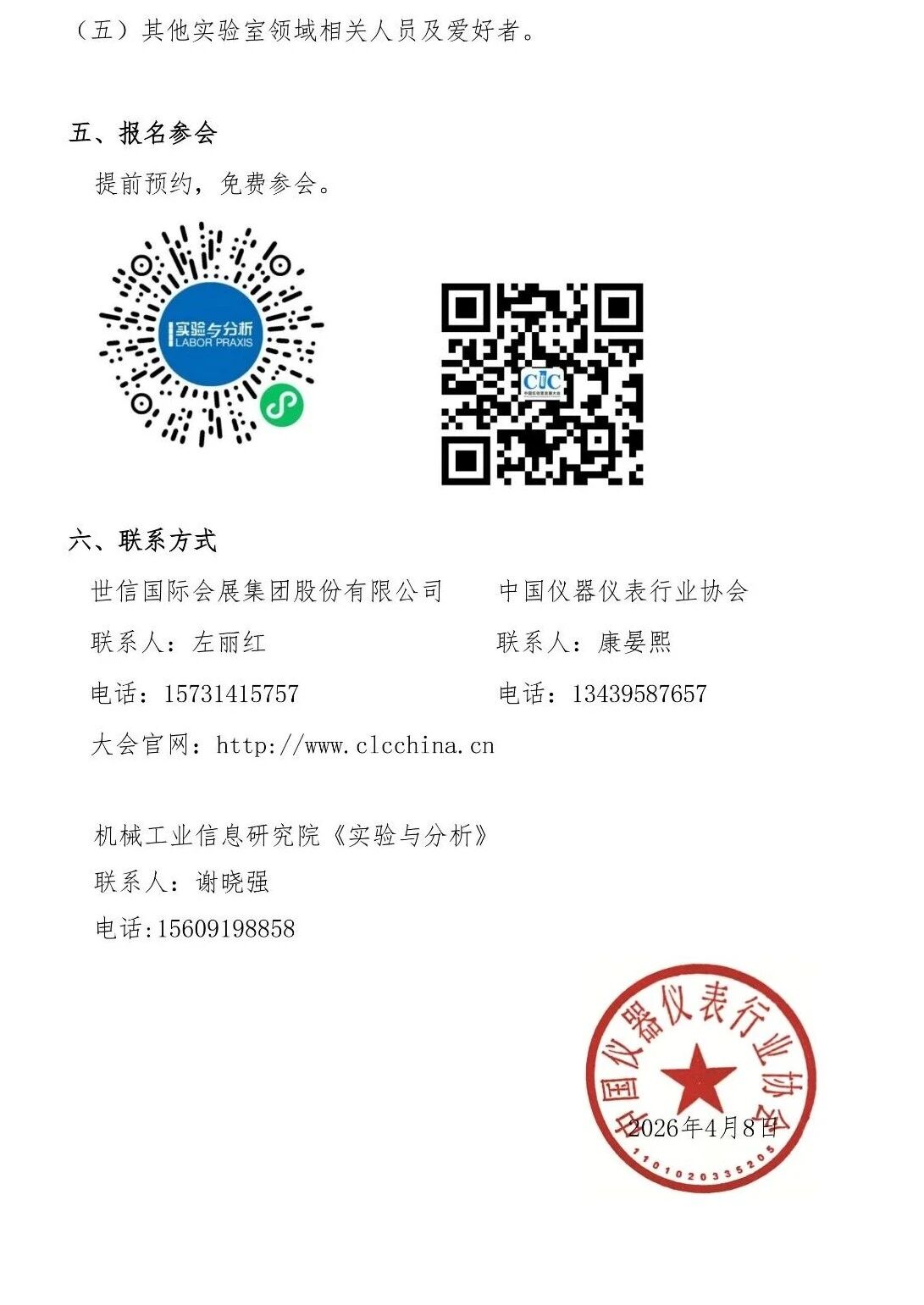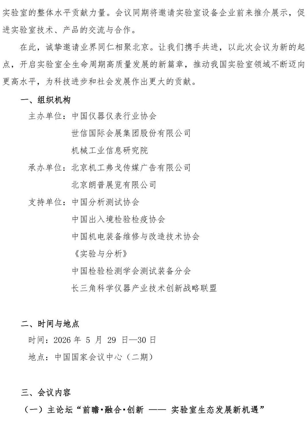 在當(dāng)今科技日新月異的時(shí)代背景下,實(shí)驗(yàn)室作為科技創(chuàng)新的重要陣地,承載著推動(dòng)知識(shí)進(jìn)步、技術(shù)突破的關(guān)鍵使命。從實(shí)驗(yàn)室的規(guī)劃與建設(shè),到日常的運(yùn)維管理,再到科研成果的產(chǎn)出與轉(zhuǎn)化,每一個(gè)環(huán)節(jié)都關(guān)乎著實(shí)驗(yàn)室的潛力能否充分發(fā)揮。由中國(guó)儀器儀表行業(yè)協(xié)會(huì)和世信國(guó)際會(huì)展集團(tuán)股主辦的第七屆中國(guó)實(shí)驗(yàn)室發(fā)展大會(huì)將于2026529-30日在國(guó)家會(huì)議中心二期舉辦!誠(chéng)摯邀請(qǐng)業(yè)界同仁相聚北京,共襄盛舉!