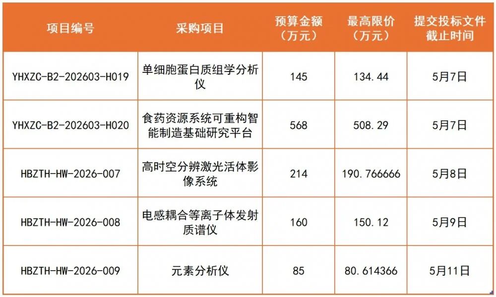 近日,武漢輕工大學生科院大型儀器設備平臺設備更新項目項目已正式啟動公開招標。本次采購涵蓋單細胞蛋白質(zhì)組學分析儀、食藥資源系統(tǒng)可重構(gòu)智能制造基礎(chǔ)研究平臺、高時空分辨激光活體影像系統(tǒng)、電感耦合等離子體發(fā)射質(zhì)譜儀及元素分析儀等多套高端科研設備,整體預算金額達1172萬元,項目最早投標截止時間為57日。