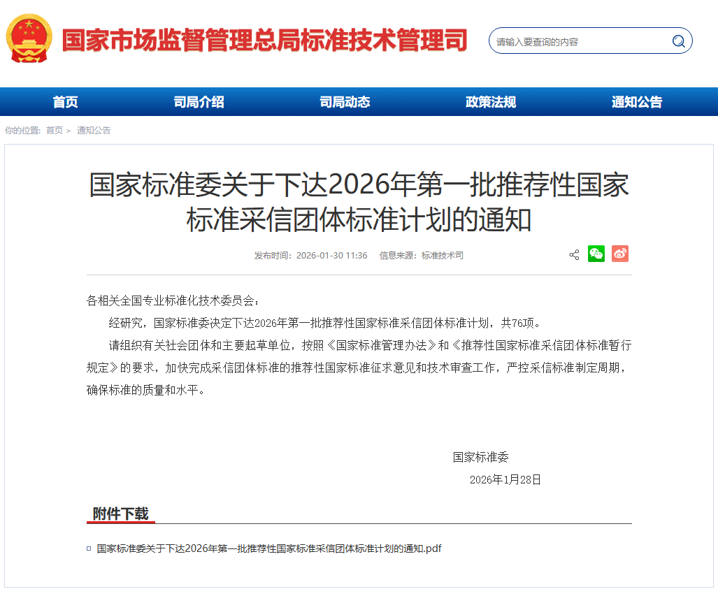 隨著《社會團(tuán)體登記管理?xiàng)l例》修訂版正式施行,國家標(biāo)準(zhǔn)化管理委員會同步下達(dá)《2026年第一批推薦性國家標(biāo)準(zhǔn)采信團(tuán)體標(biāo)準(zhǔn)計(jì)劃》,76項(xiàng)團(tuán)體標(biāo)準(zhǔn)正式納入推薦性國家標(biāo)準(zhǔn)計(jì)劃。